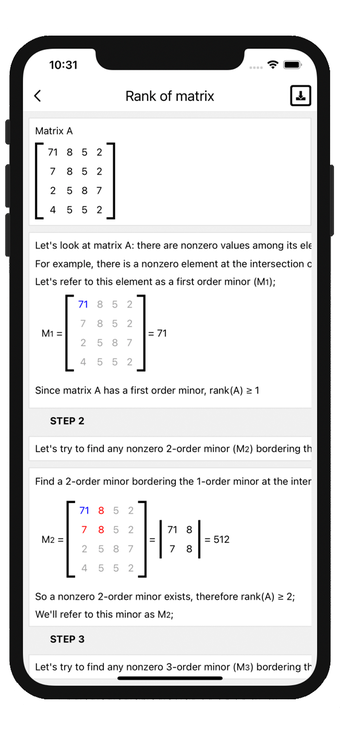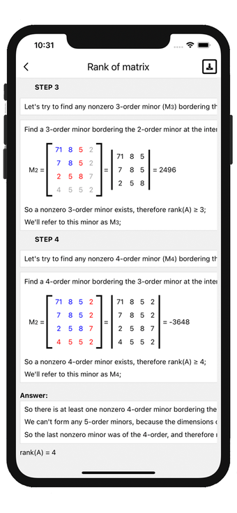 La interfaz incluye un teclado personalizado que facilita la entrada de datos y proporciona descripciones detalladas de cada solución paso a paso. Matrix operations permite guardar y editar soluciones, lo que mejora la experiencia del usuario. No requiere conexión a Internet, lo que la hace accesible en cualquier momento y lugar. Los resultados se presentan tanto en fracciones ordinarias como decimales, lo que añade versatilidad a la herramienta.